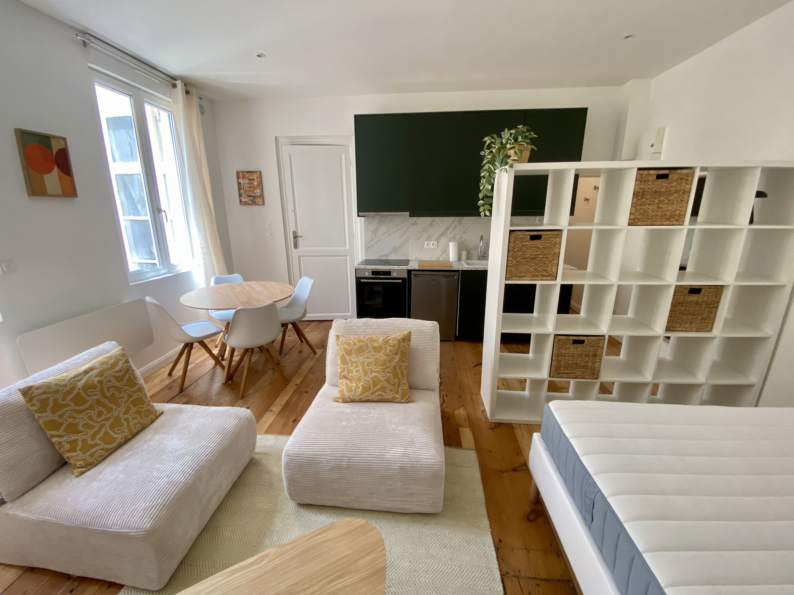 Une entrée séparée avec coin buanderie, un séjour avec une cuisine équipée (plaque induction 3 feux, four, frigo, hotte et machine Nespresso).