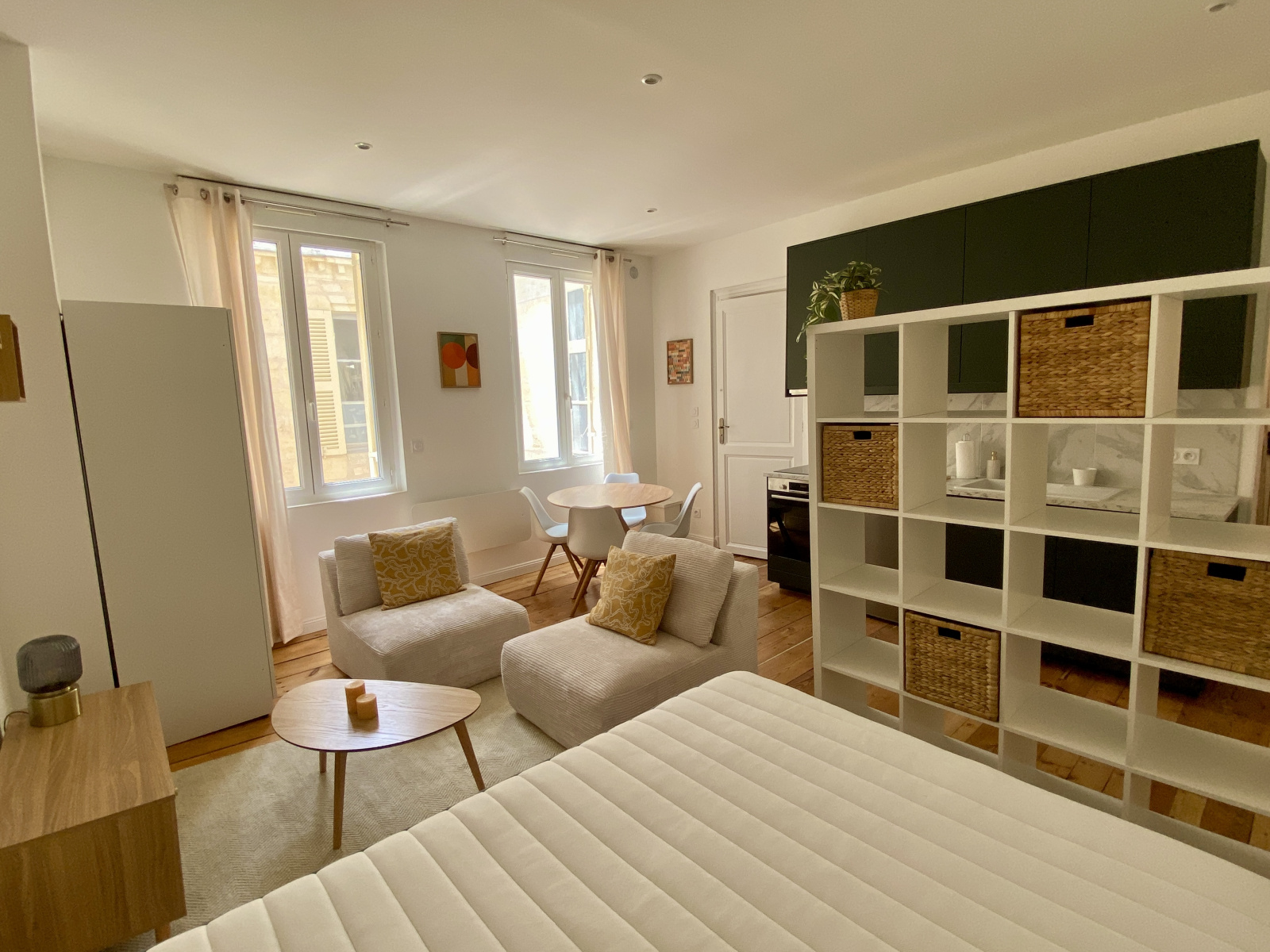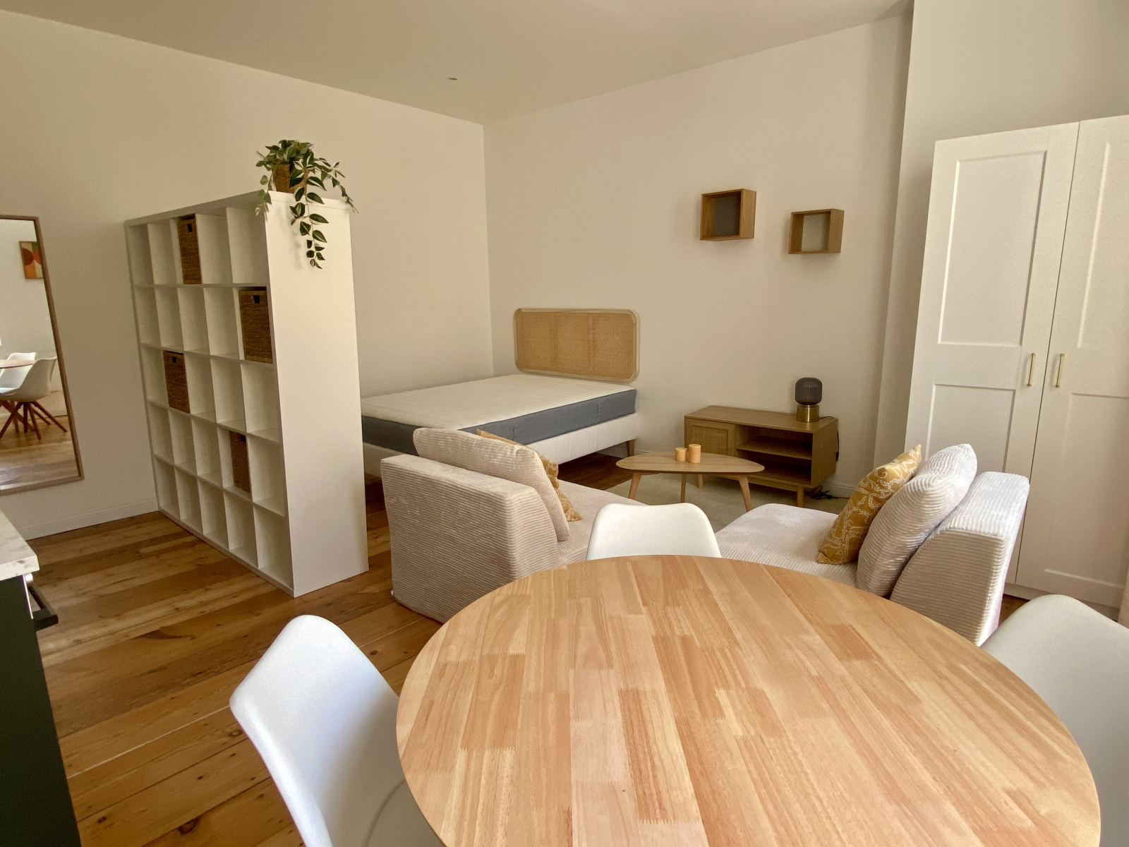 Lit + sommier tapissier 140 x 200. Coin salon. Table dinatoire avec 4 chaises. Plusieurs placards de rangement.