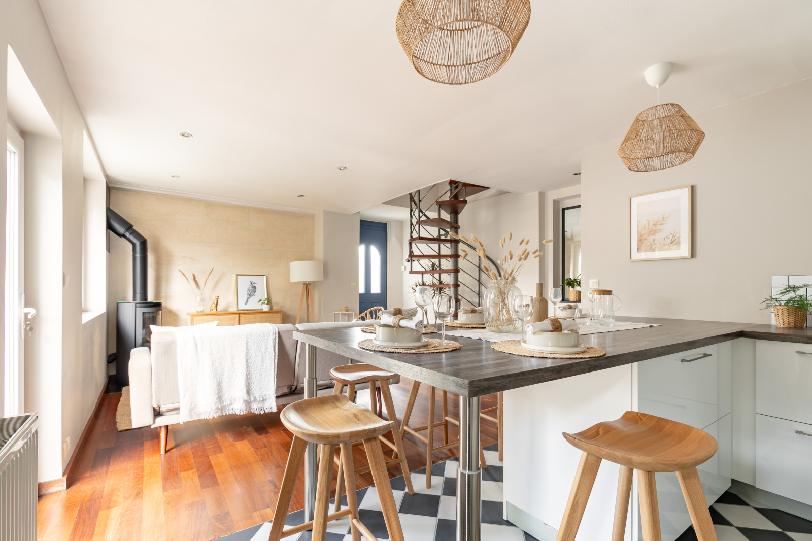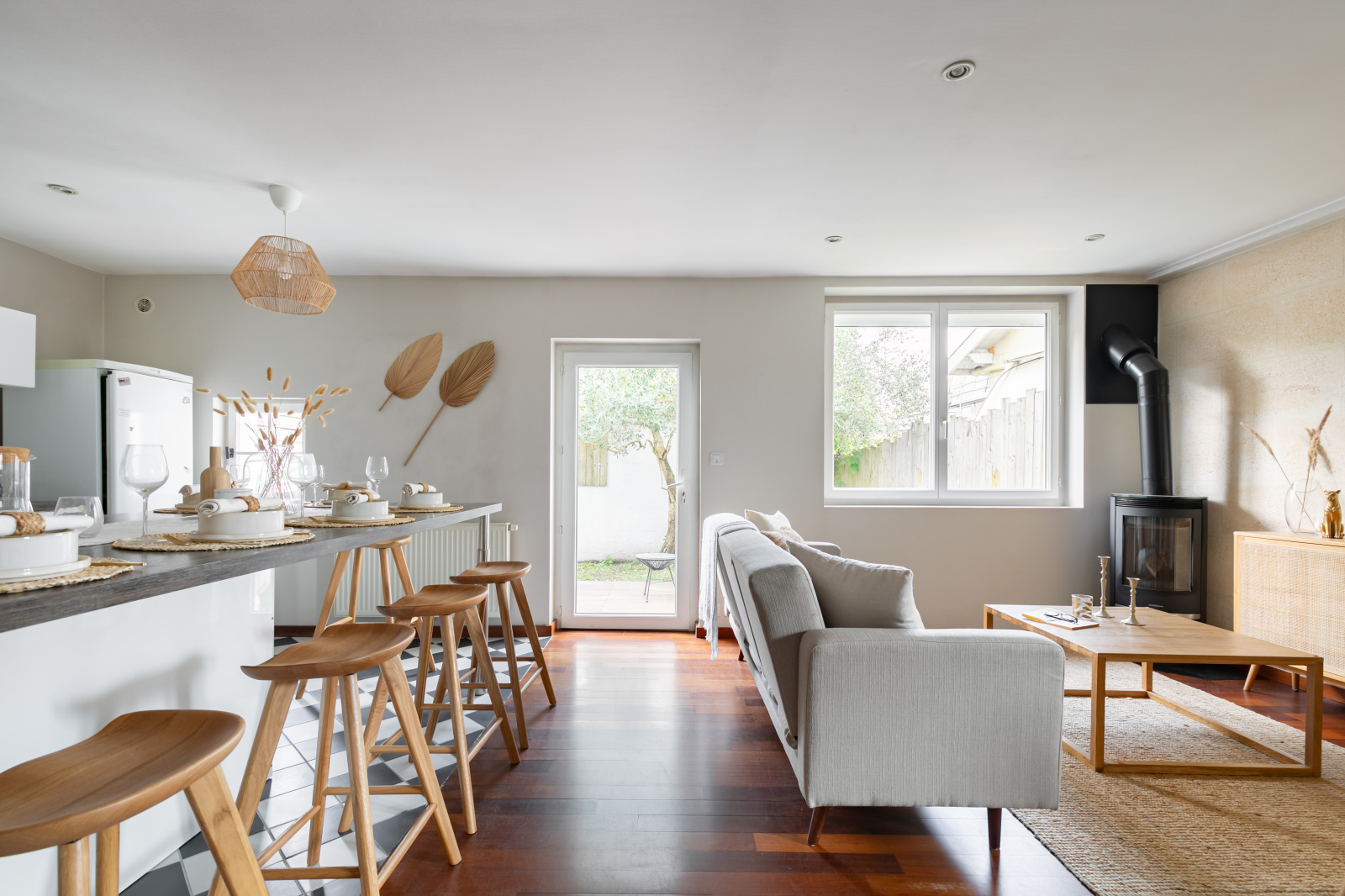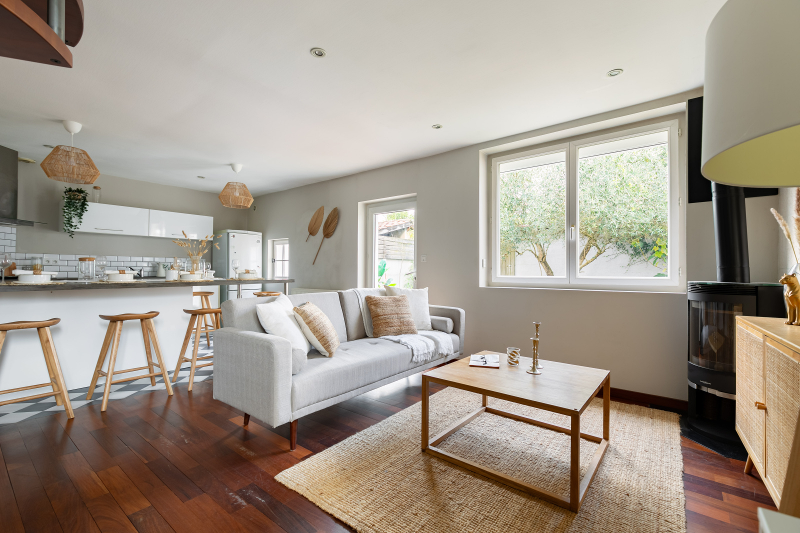 Au rez-de-chaussée, l'entrée ouvre sur la pièce de vie de 30 m2 avec cuisine ouverte, grand ilot central faisant office de table dinatoire et coin salon avec poêle à bois. Vous retrouverez également une buanderie avec rangements, un wc séparé, et un espace bureau très pratique de 14 m2 avec second accès rue (ancien garage).