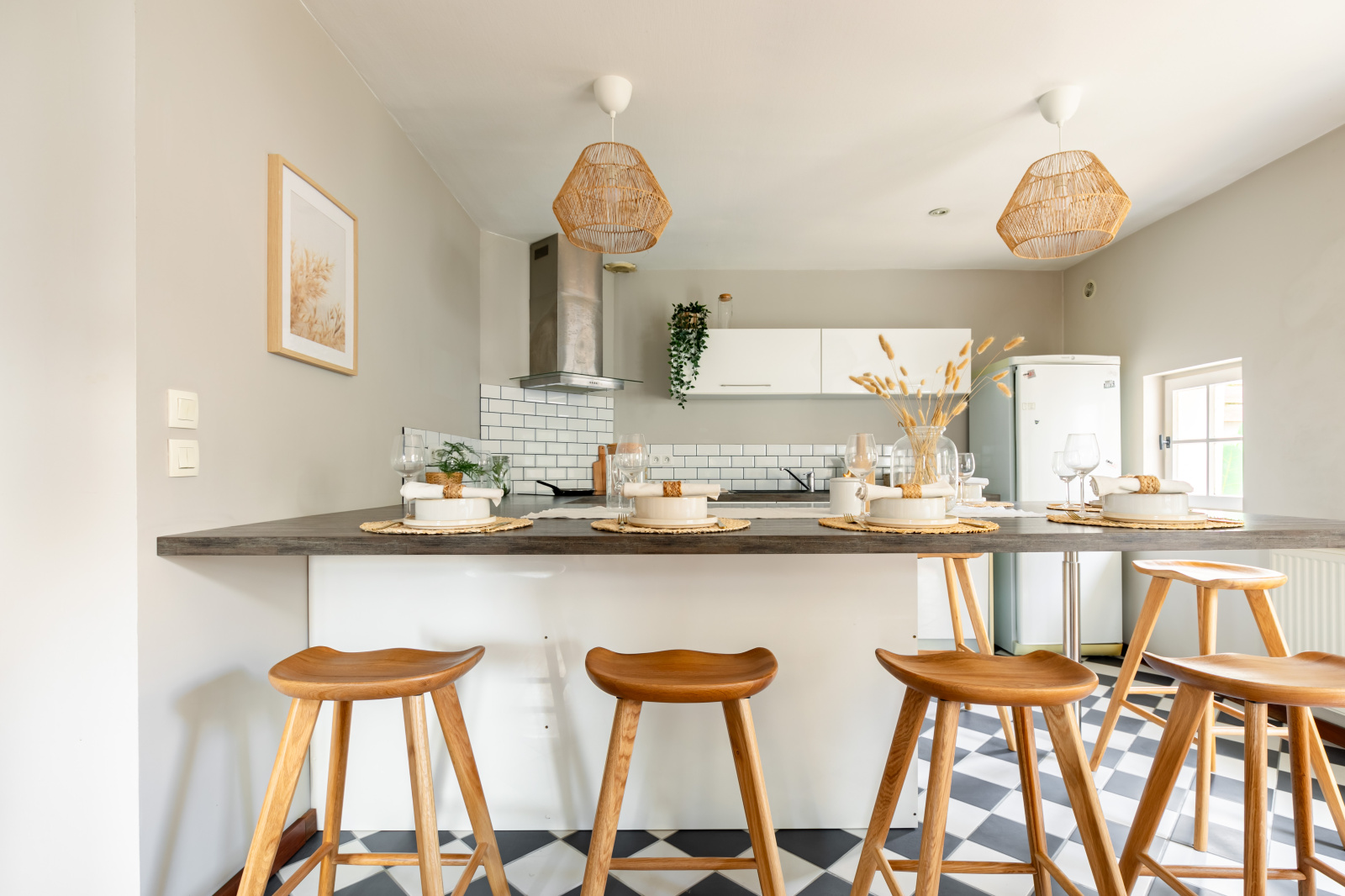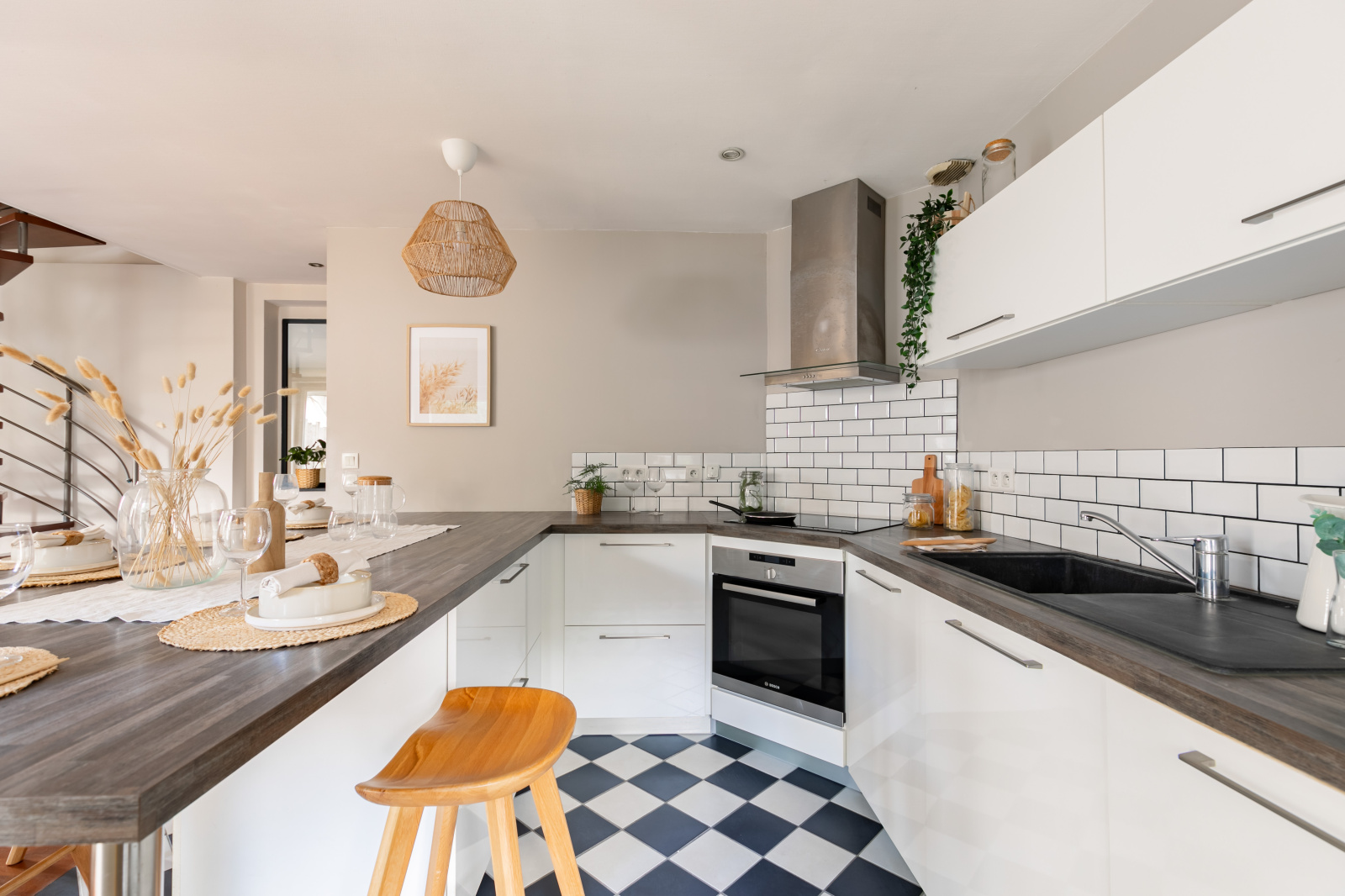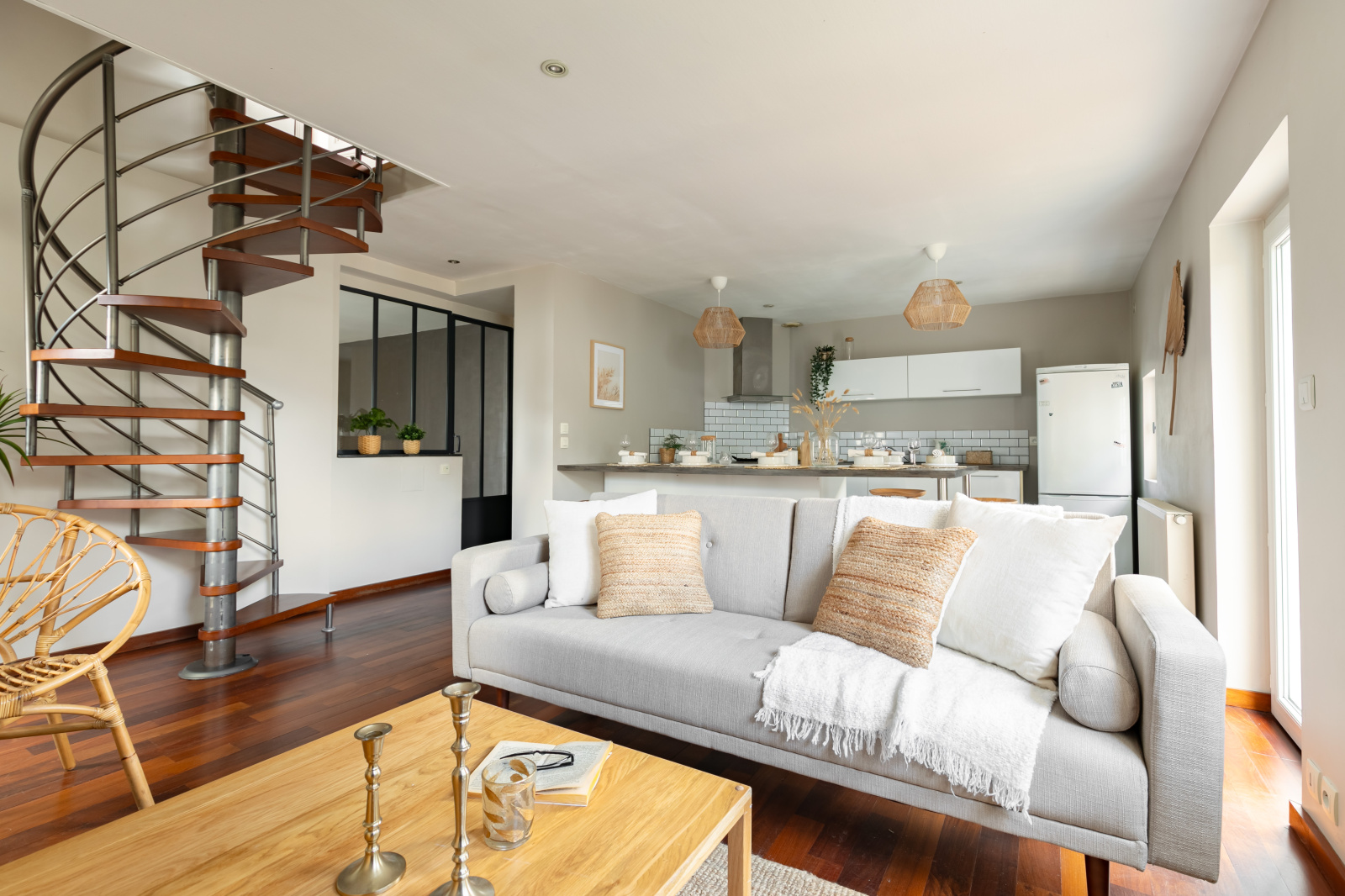 Au rez-de-chaussée, l'entrée ouvre sur la pièce de vie de 30 m2 avec cuisine ouverte, grand ilot central faisant office de table dinatoire et coin salon avec poêle à bois. Vous retrouverez également une buanderie avec rangements, un wc séparé, et un espace bureau très pratique de 14 m2 avec second accès rue (ancien garage).