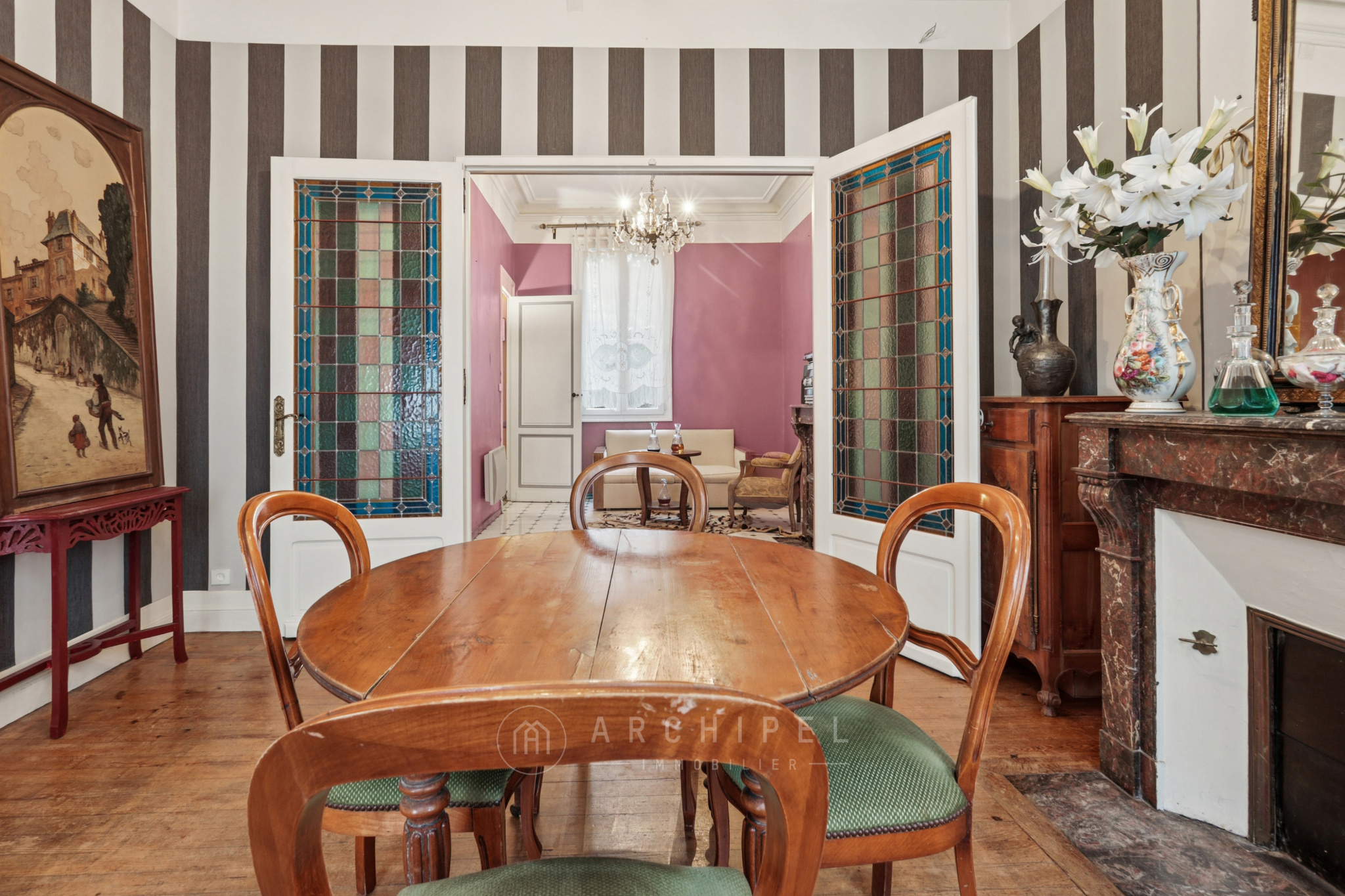 Une cave saine de 20m2 complète ce bien. Belles prestations anciennes conservées : carreaux de ciment, moulures, belles hauteurs, vitraux.