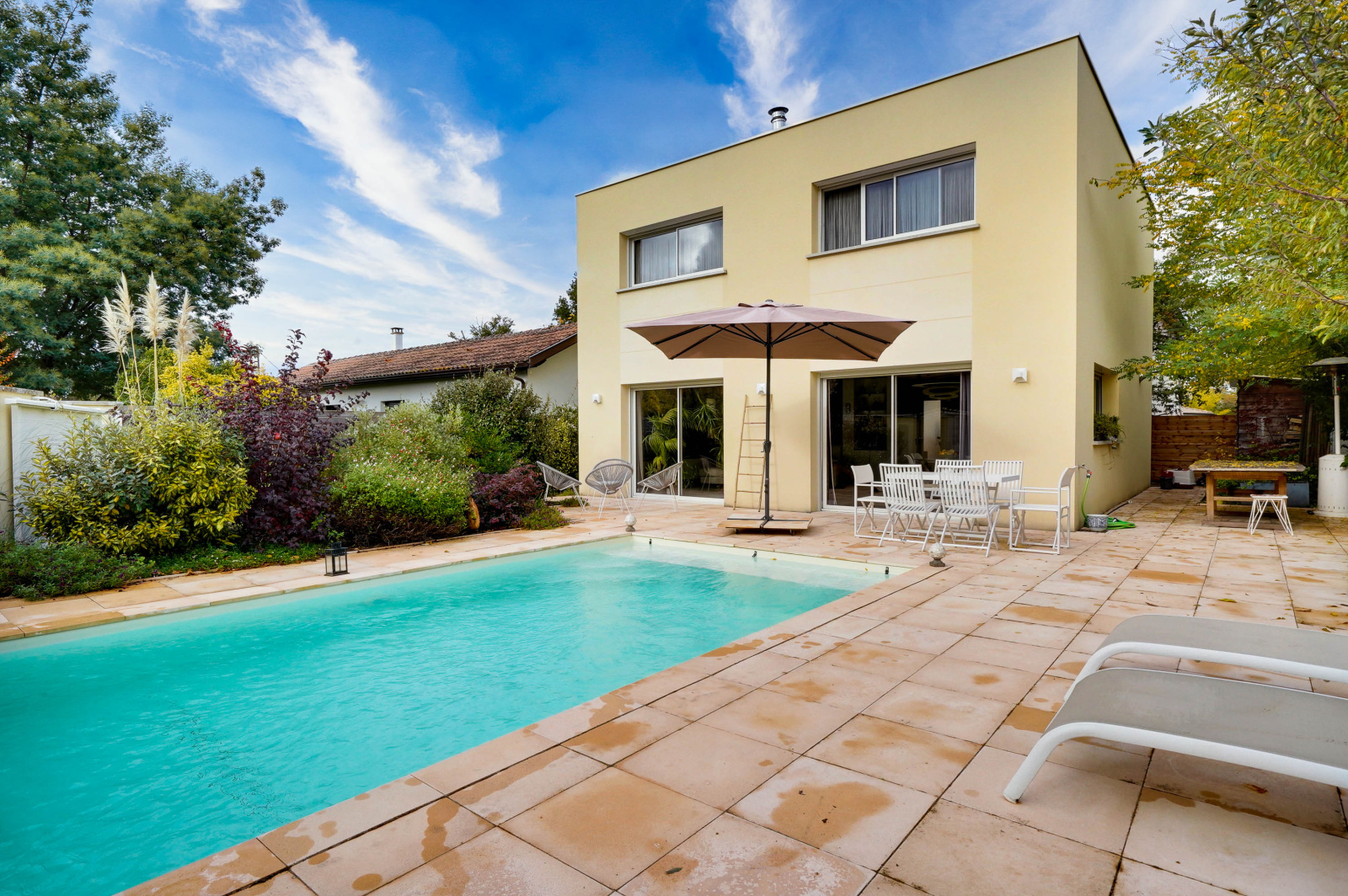 A 2min des écoles et du bourg de Saint-Selve, belle maison contemporaine de 2018 d'une surface de 119 m2 sur deux niveaux. Le rez-de-chaussée composé d'un hall d'entrée avec placards ouvre sur la grande pièce de vie : Salon-séjour avec poêle à bois avec belle cuisine ouverte toute équipée, le tout traversant avec vue sur la piscine. Egalement, vous trouverez une buanderie et de nombreux rangements ainsi qu'un wc indépendant. Un bel escalier mène au palier du 1er pour desservir une suite parentale de 20m2 avec sa salle d'eau et 2 jolies chambres avec rangements avec une salle de bains également. Cette maison fonctionnelle et bien conçue, profite d'une exposition Sud-Est qui la rend très lumineuse et agréable à vivre. Un aménagement paysager a été pensé autour de la maison où vous retrouverez devant (côté Sud) une piscine au sel avec une grande terrasse et à l'arrière un jardin avec pergola et cabanon en bois. La parcelle entièrement clôturée mesure 475 m2. Pour plus de renseignements et dossier complet avec photos, vous pouvez joindre M. Marchyllie au 06 22 29 51 91.